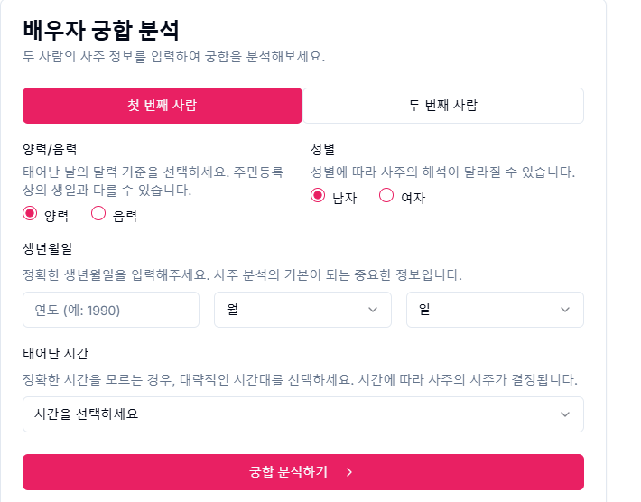 배우자의 생년월일과 , 본인의 생년월일을 입력 후 "궁합 분석하기" 버튼을 누르면